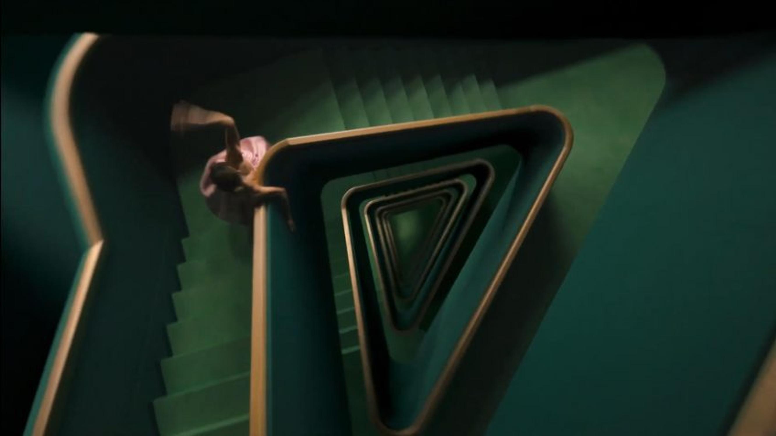 Le flacon Paradigme illustre cette exploration dans son design-même : la pointe du logo Prada (triangulaire) invite à plonger en profondeur, dans les eaux troubles de l’identité. Une plongée incarnée dans un plan d’Emma Watson - dans le film du parfum Paradoxe -, qui dévale un escalier tapissé de vert reprenant la forme du logo et mimant une mise en abîme par la révélation successive de ses strates et de l’obscurité dans laquelle elle s’enfonce.
