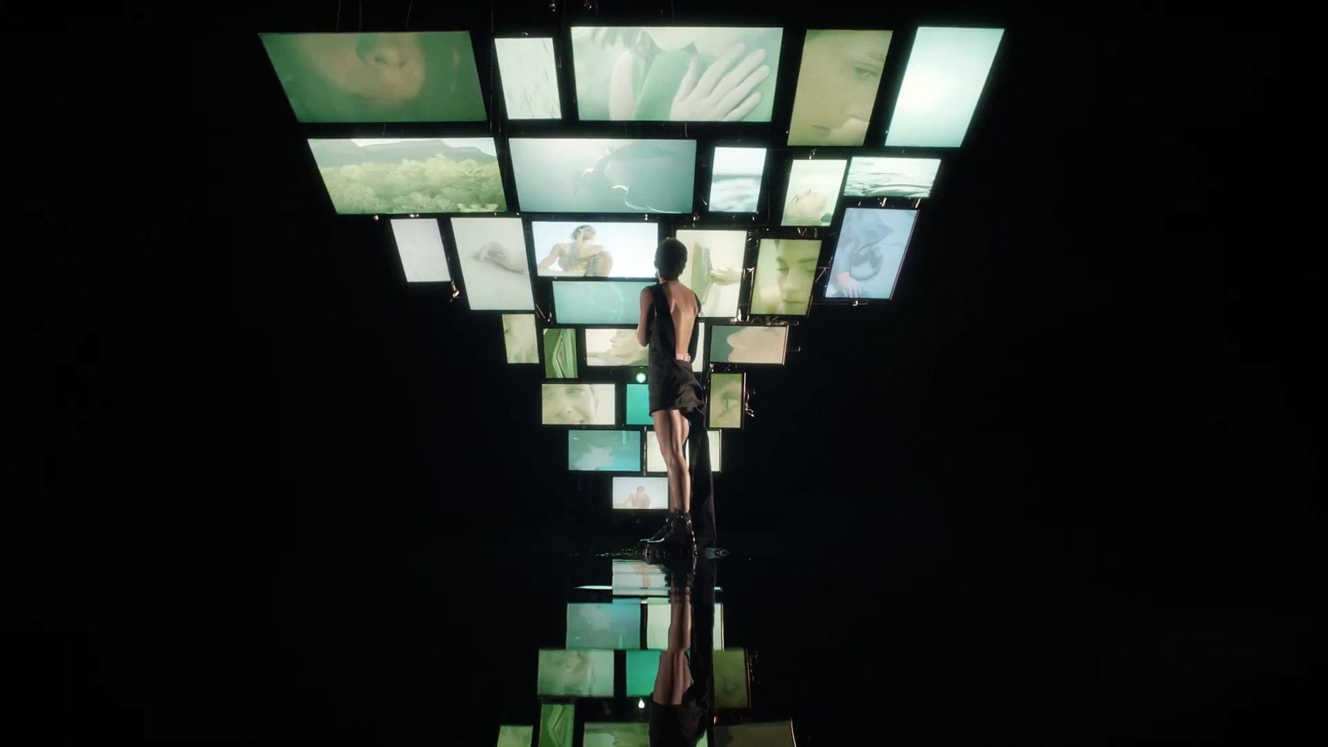 ‘Why should I be framed ?’. Une introspection également du côté de Watson. Elle aussi est dos à nous. Elle aussi a un miroir mais symbolisé par une flaque d’eau qui reflète ses différentes facettes, celles qui apparaissent sur une multitude d’écrans, qui diffusent des images d’elle. C’est comme si elle aussi regardait à travers une fenêtre.