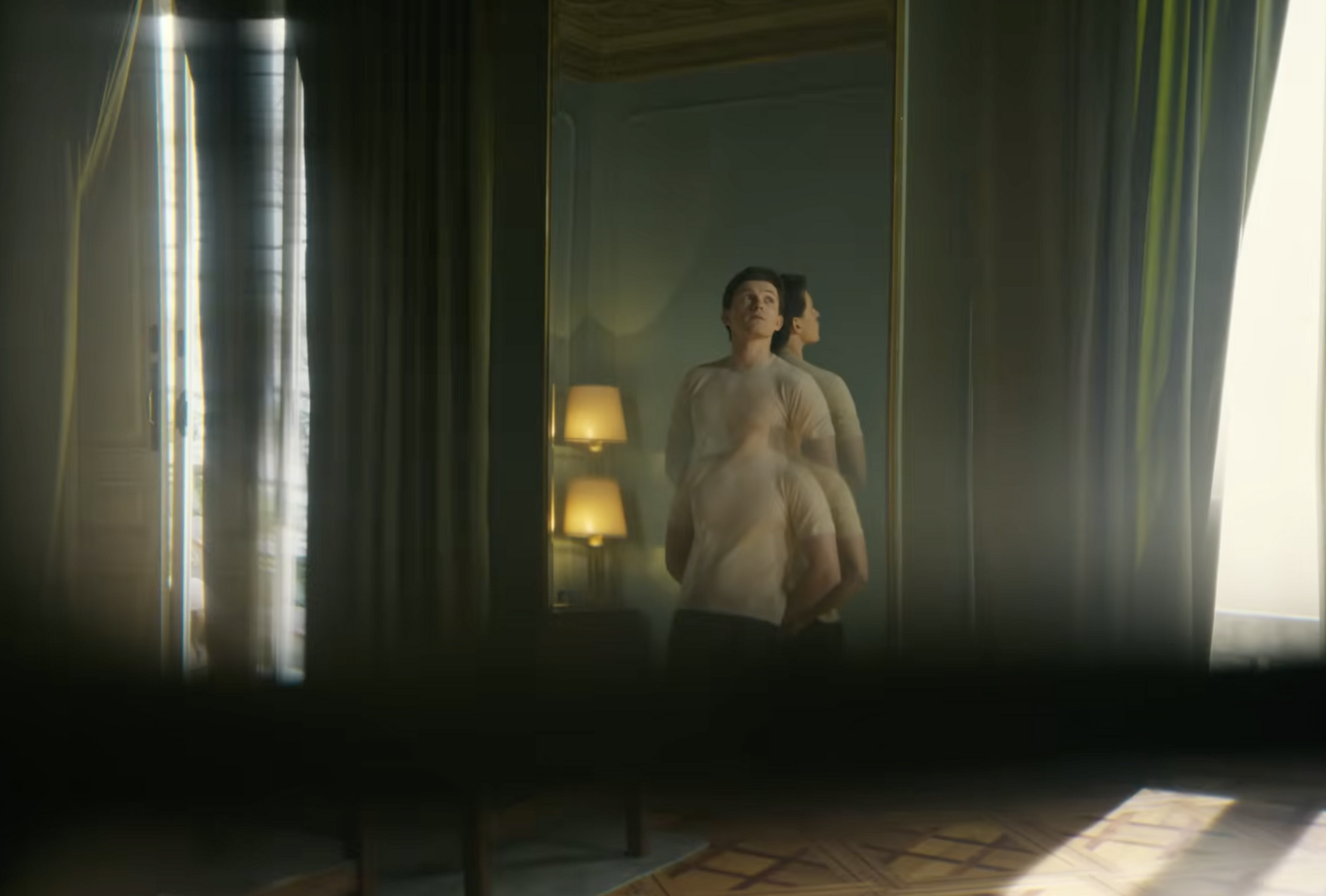 Pour Tom Holland, le film s’ouvre sur l’ouverture d’un rideau : une vue sur le monde et les possibles. Renforcée par un miroir, celui qui offre un nouvel angle de vue. Un miroir pour le renversement des repères. Par proxy du miroir, on incarne le dédoublement, un changement de Paradigme qui s’opère. Holland est dos au miroir car il se cherche.
