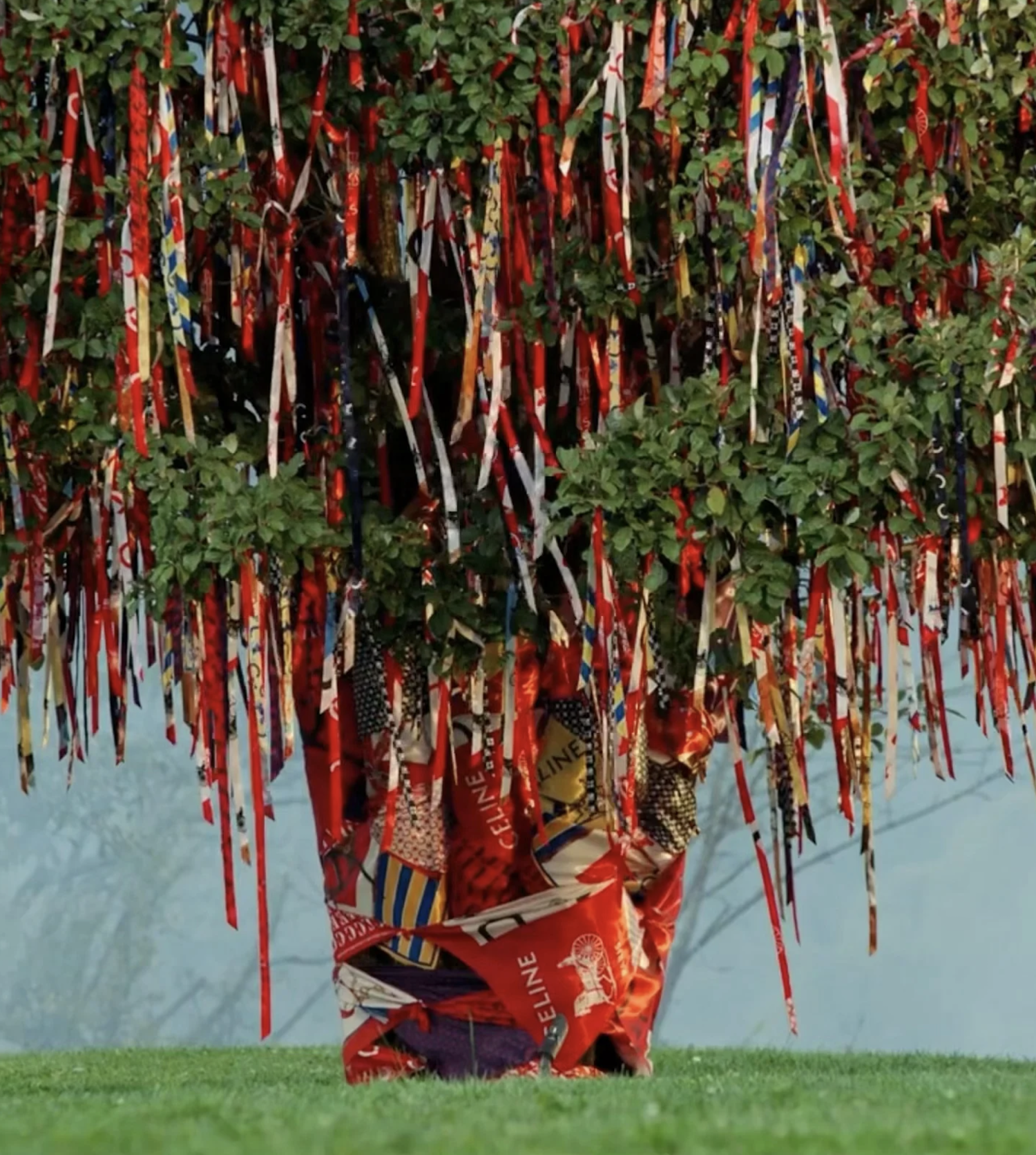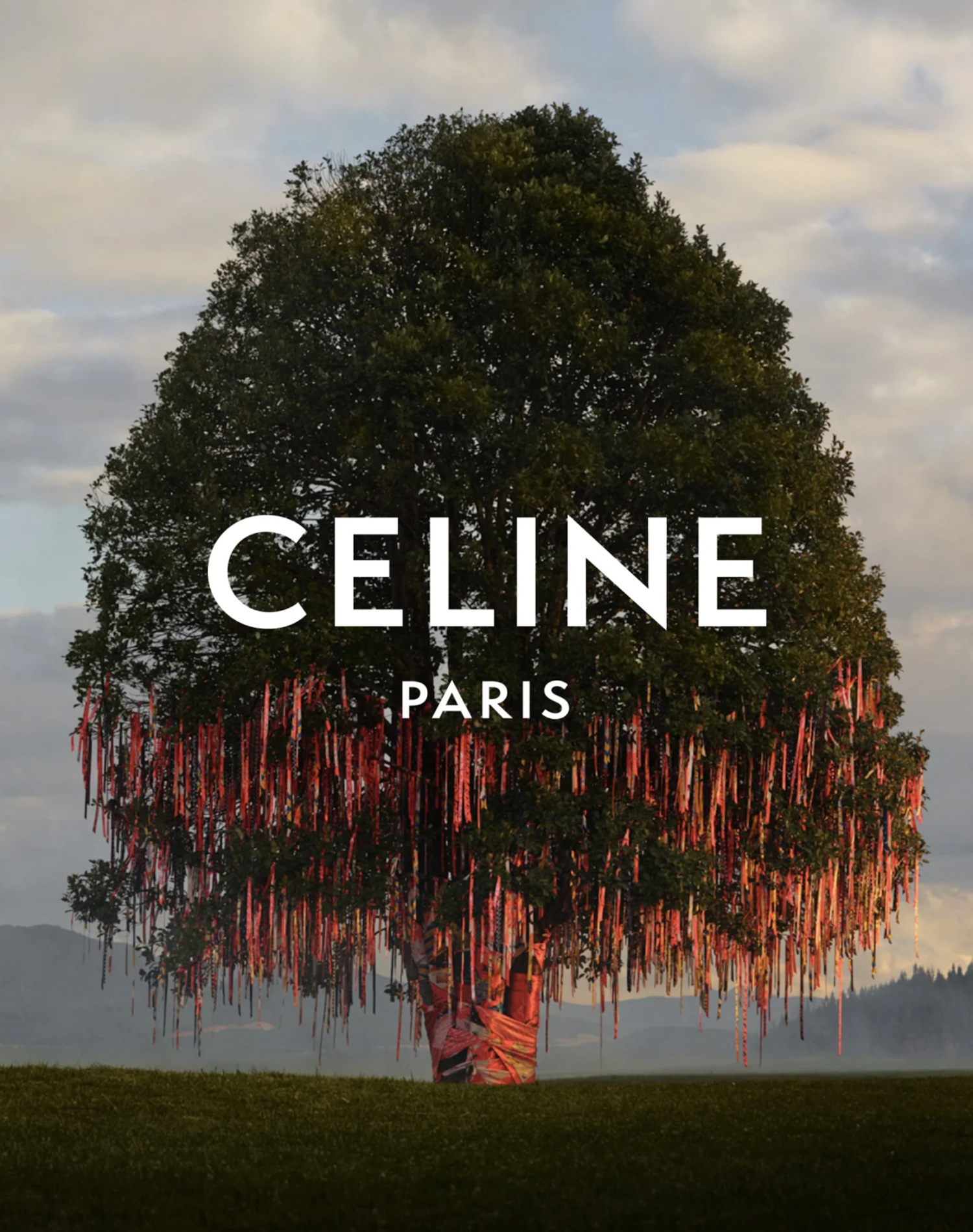 Céline a lancé une campagne ancrée dans la tradition chinoise de l’arbre à vœux, rituel ancestral où les fidèles nouent des prières aux branches pour invoquer la bonne fortune. La pièce maîtresse visuelle : un arbre à feuillage persistant monumental, orné de milliers de foulards et rubans Céline, photographié avec une précision minimaliste. La campagne relie les 60 ans d’héritage du foulard Céline au symbolisme zodiacal contemporain, positionnant la marque comme gardienne du sens rituel plutôt que de la tendance saisonnière.