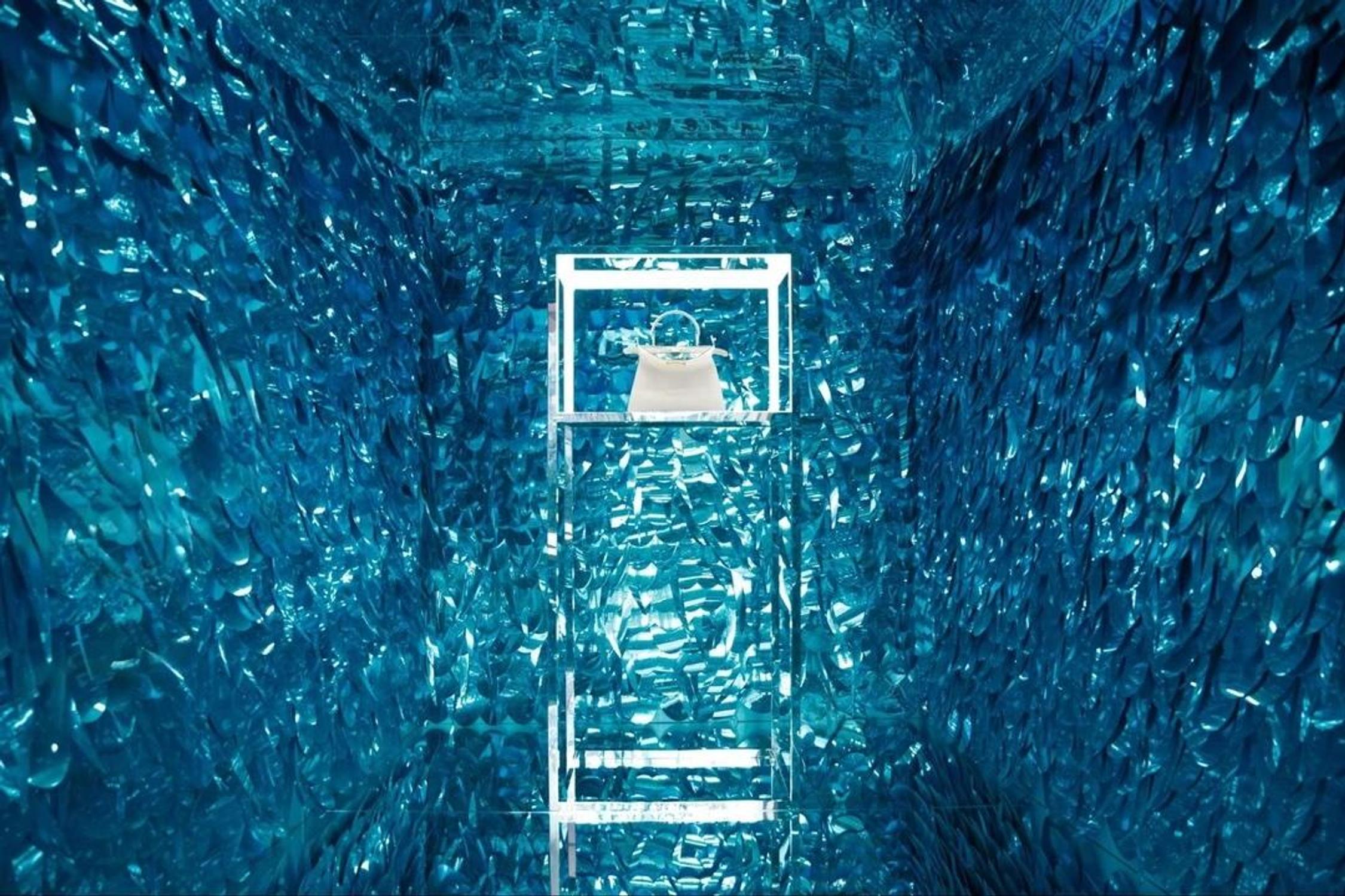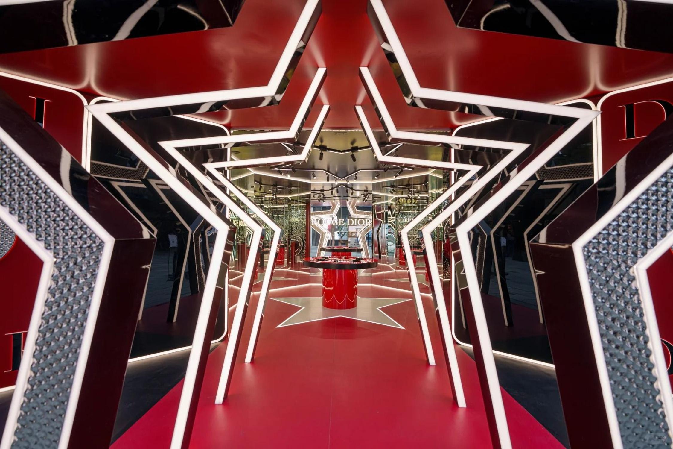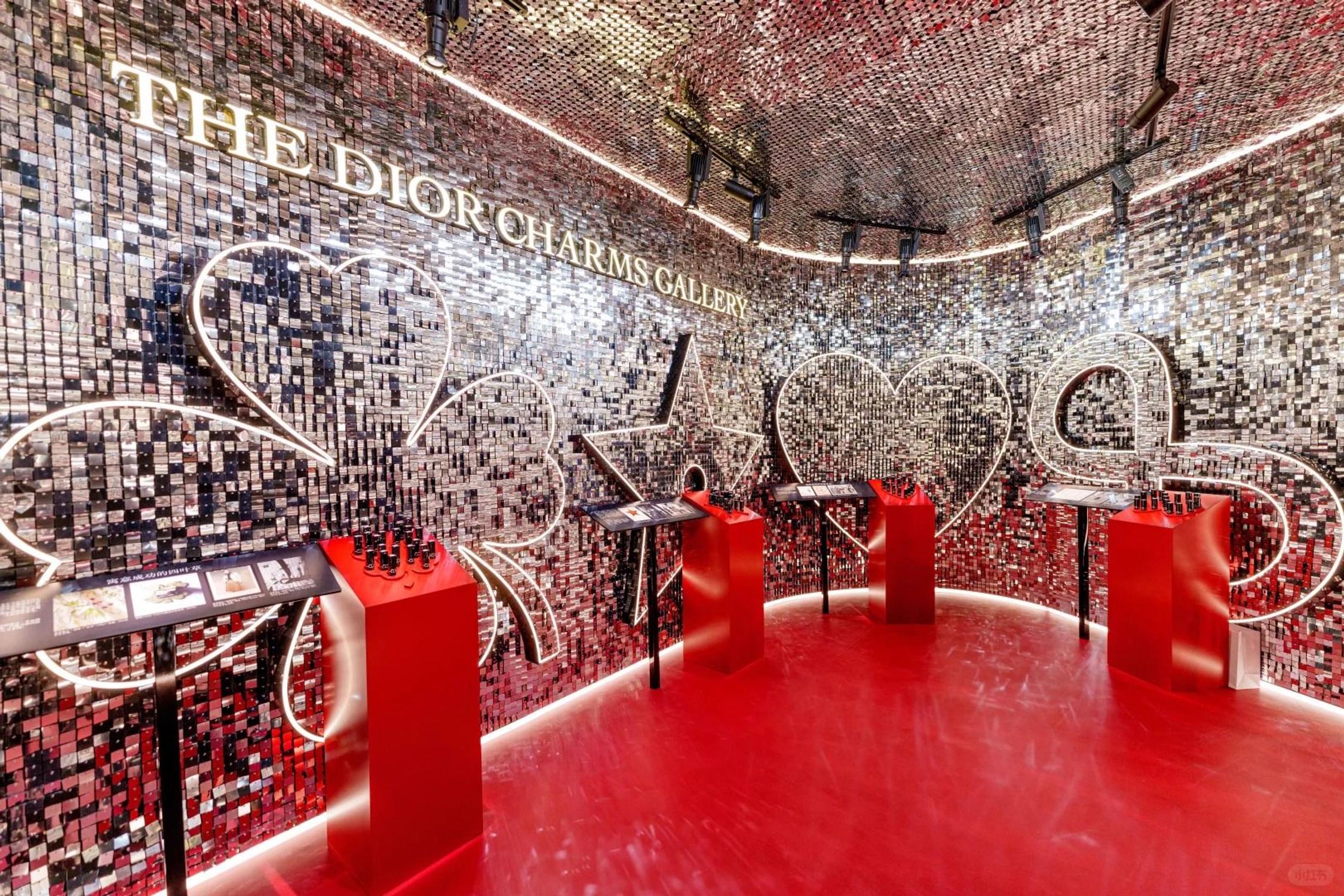 Modules extérieurs rouges : cœurs, étoiles, trèfles et signaux "lucky 8", épèlent "DIOR" tout en fonctionnant comme repère social. Plafonds miroirs et stations vanity théâtrales portent la logique du charme porte-bonheur à l’intérieur, transformant les symboles de fortune en environnement immersif et photographiable.