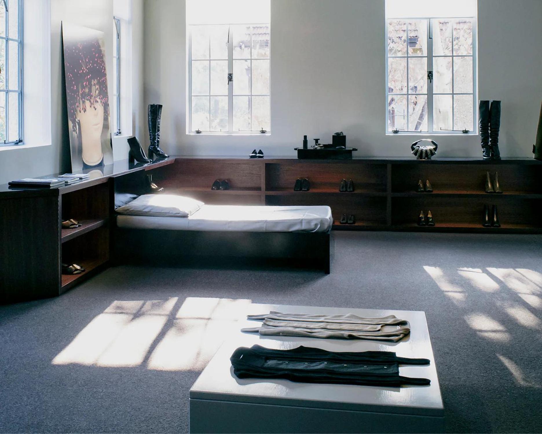 Les caisses de transport deviennent modules d’exposition, les rails en laiton évoquent les convoyeurs à vêtements : des matériaux recyclés, codés atelier, cadrent les manteaux comme objets de savoir-faire. L’espace vend d’abord "l’héritage manufacturier", le produit ensuite — le retail transformé en galerie de la fabrication.