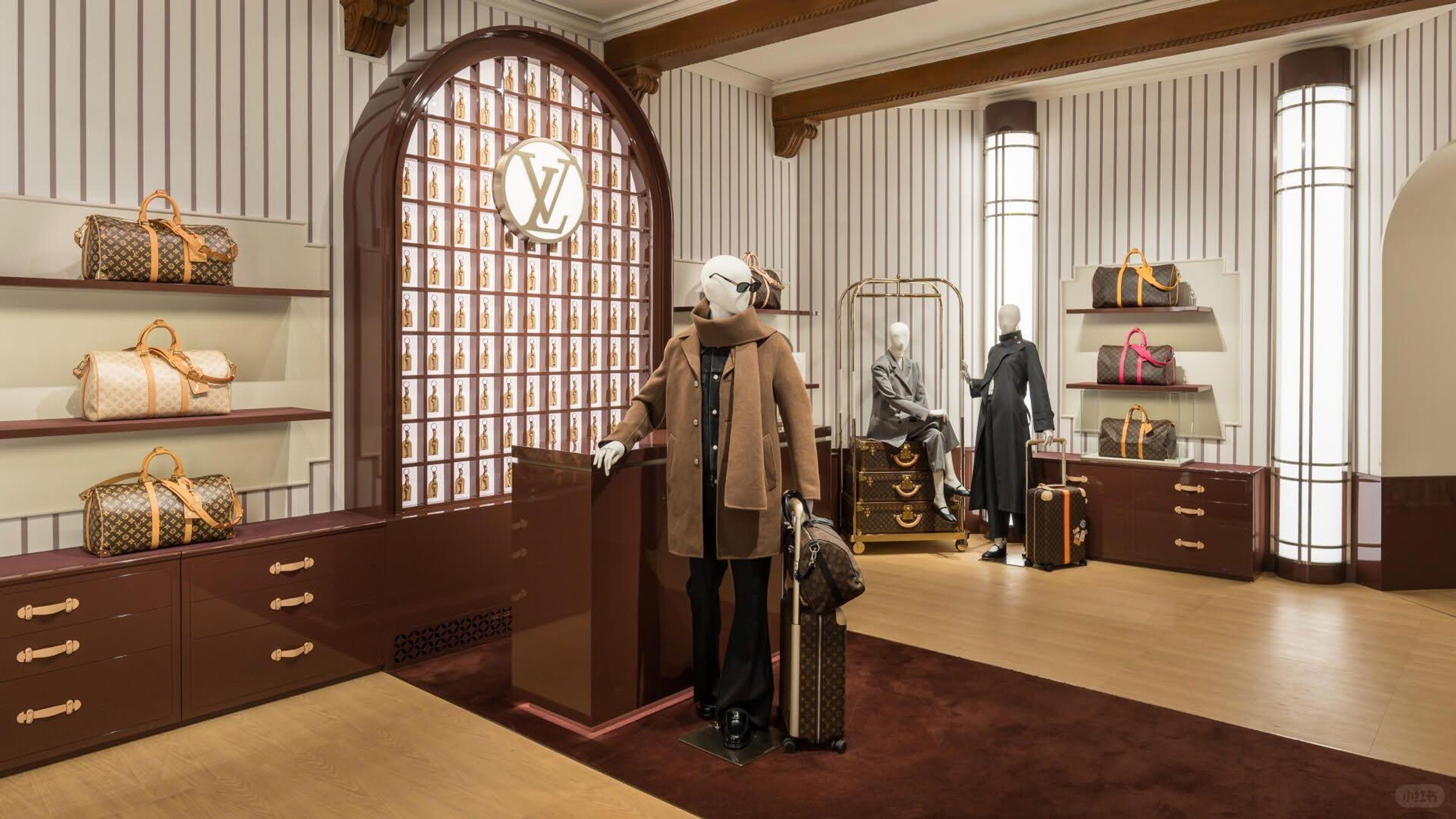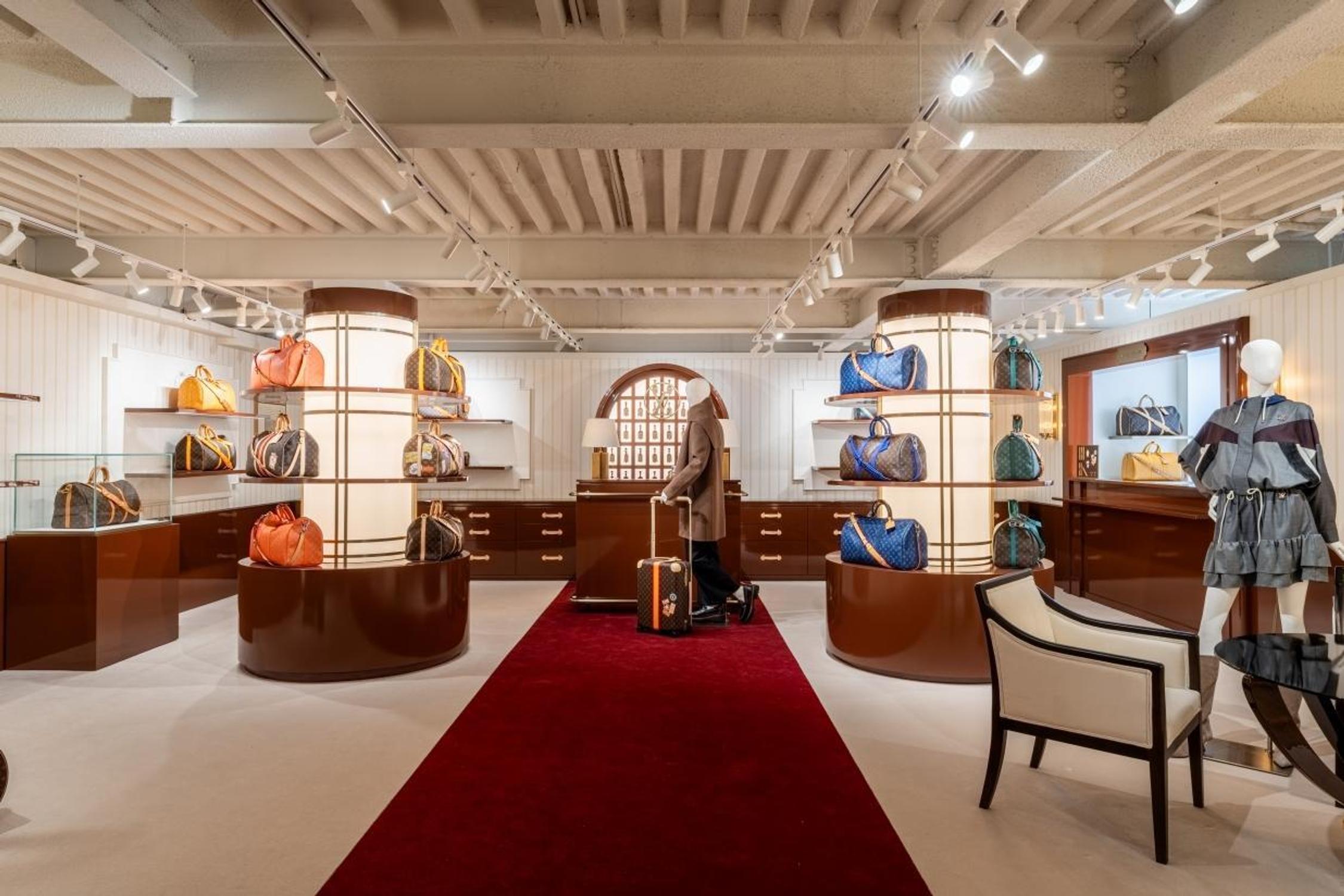 Le Monogram de Georges Vuitton (1896) devient la colonne vertébrale muséale de la rénovation, avec une mise en scène patrimoniale des sacs les plus reconnaissables de la Maison dans des "chambres" distinctes, positionnant la boutique comme archive vivante des codes design et du savoir-faire.