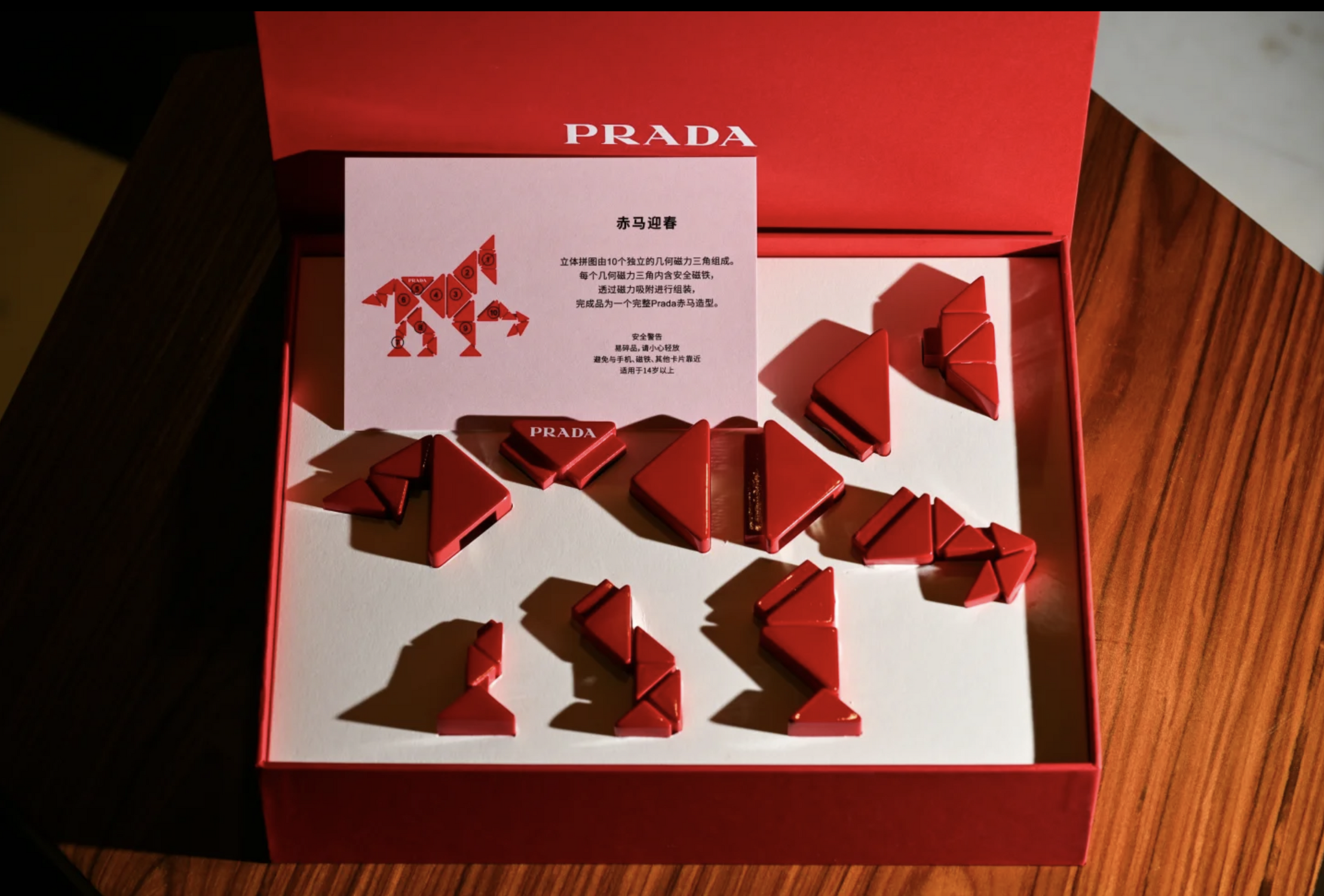Prada a célébré le retour du Cheval de Feu zodiacal (cycle de 60 ans) par une réinterprétation géométrique : le Triangle iconique devient un prisme qui transforme le cheval en avatar décliné sur les visuels de campagne, les projections et les installations dans trois villes. L’alignement du symbolisme du zodiac (dynamisme, passion, esprit de leadership) avec les codes Prada assure une cohérence conceptuelle en boutique, installations et événements.