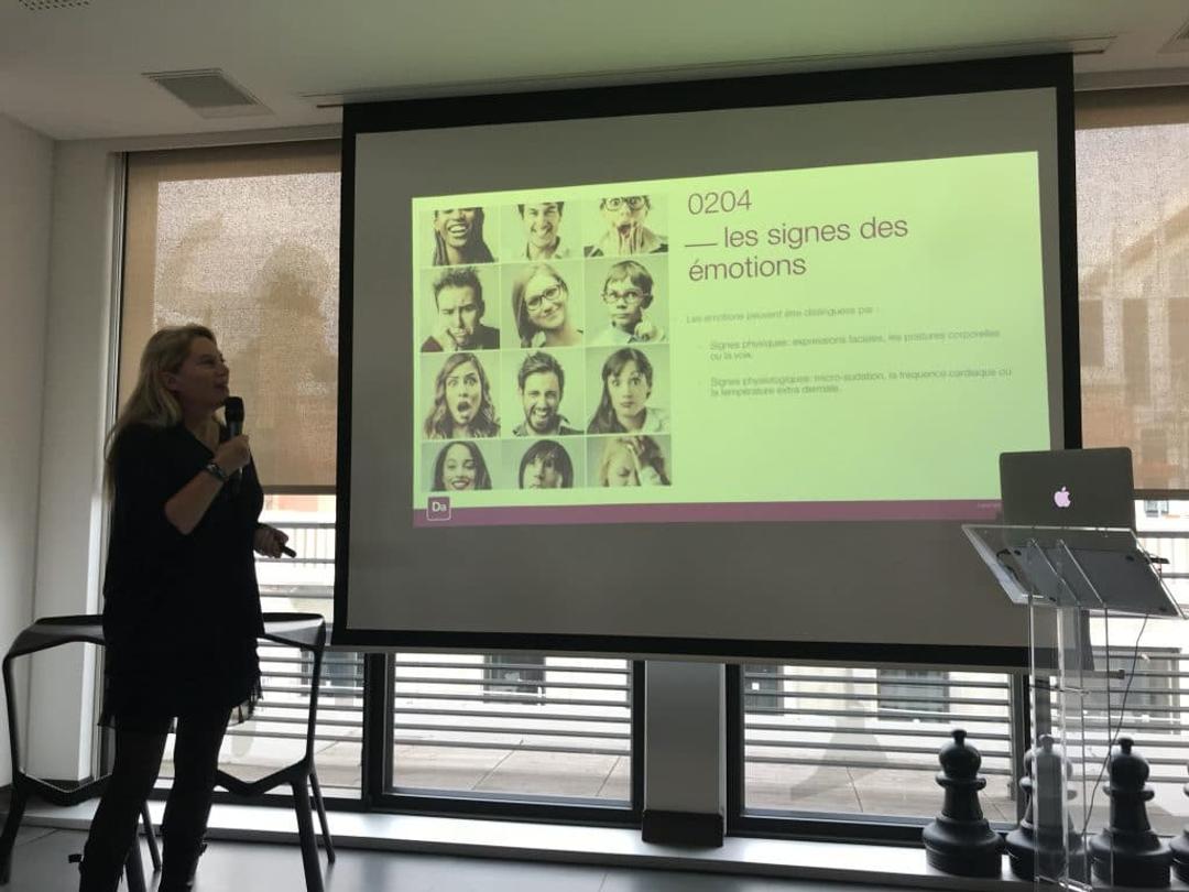 Anne-Marie Gaultier présente deux outils permettant d’analyser les émotions : le facial coding et le bracelet connecté.