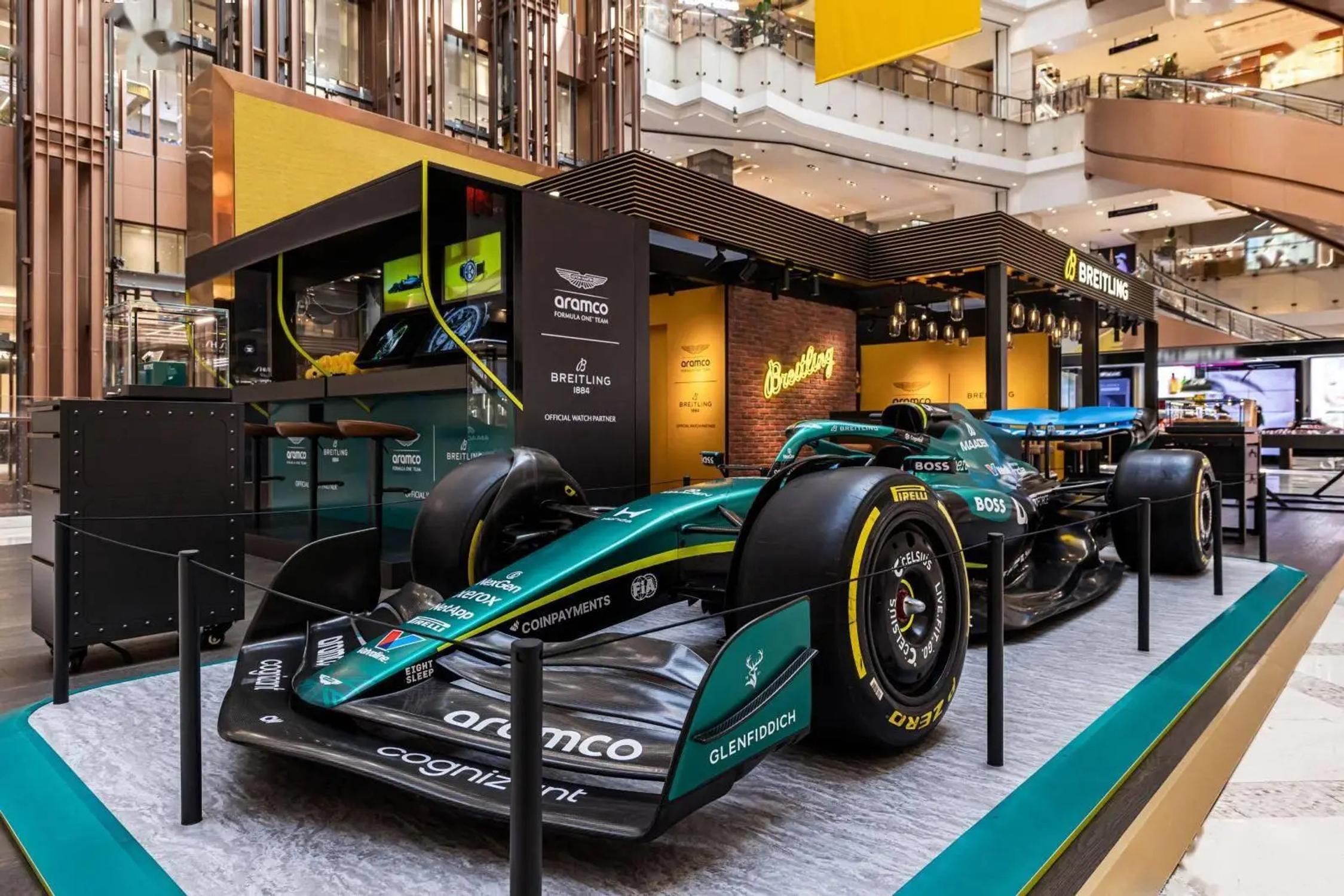 L'espace recréait l'énergie du circuit à travers des lignes courbes, des matériaux métalliques, un design industriel et un modèle central à l'échelle 1:1 d'une Aston Martin F1, transformant l'atrium du centre commercial en environnement de marque à très forte visibilité.