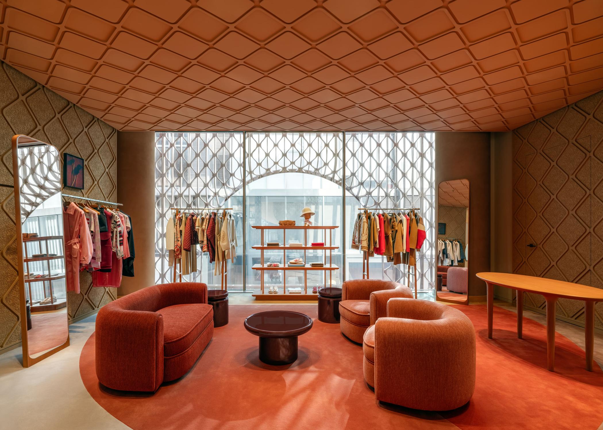 La boutique comprend trois zones de vente circulaires, un salon privé et une atmosphère de galerie pensée pour encourager une découverte plus lente et une expérience client plus élevée.
