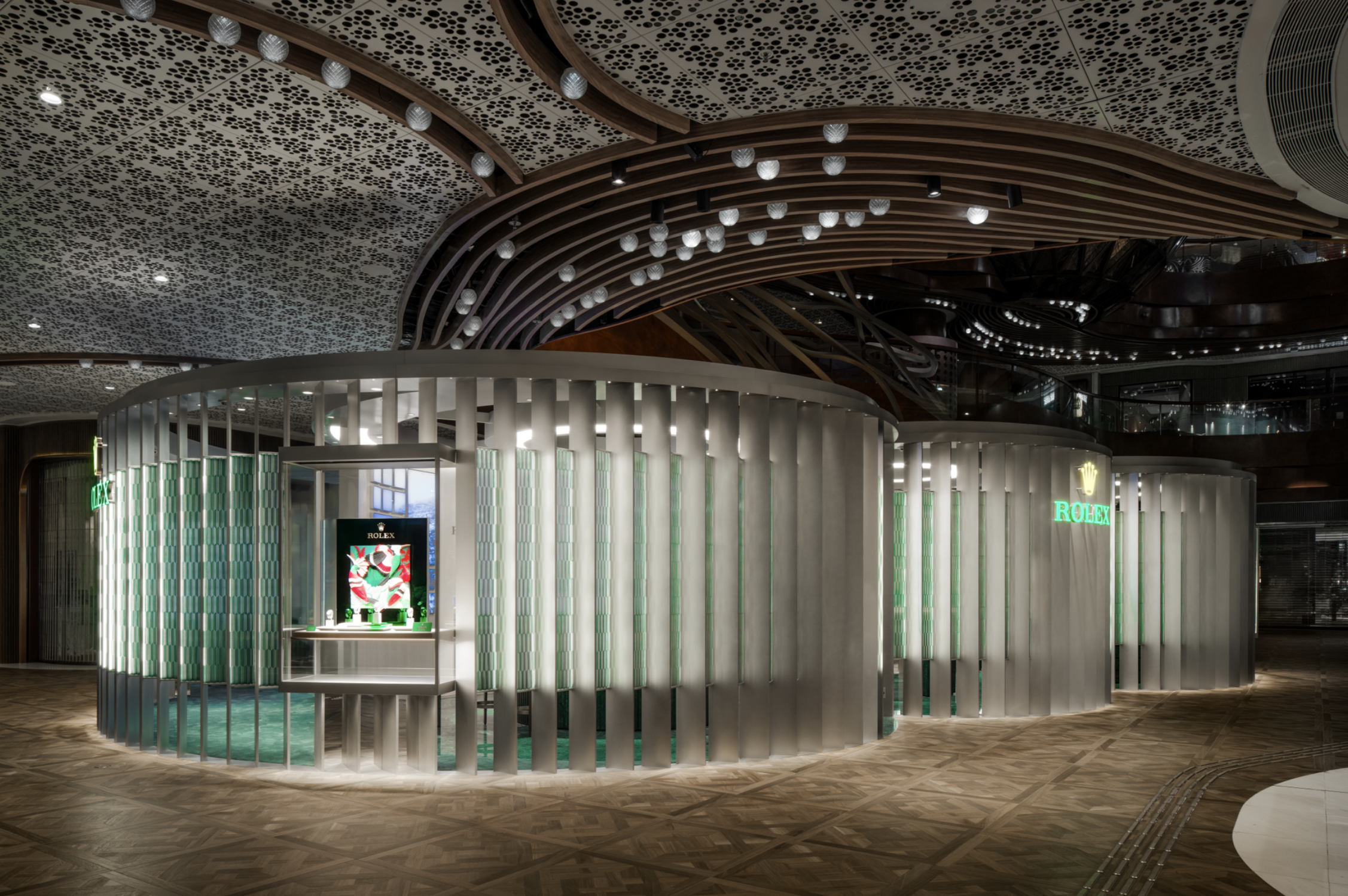 Créé par le studio tokyoïte CURIOSITY avec les architectes de Rolex, l'espace de 120 m² s'inspire du concept du K11 Musea "A Muse by the Sea" à travers des agencements circulaires, un sol vert, des accents bronze et un travail du verre inspiré de la lunette horlogère.