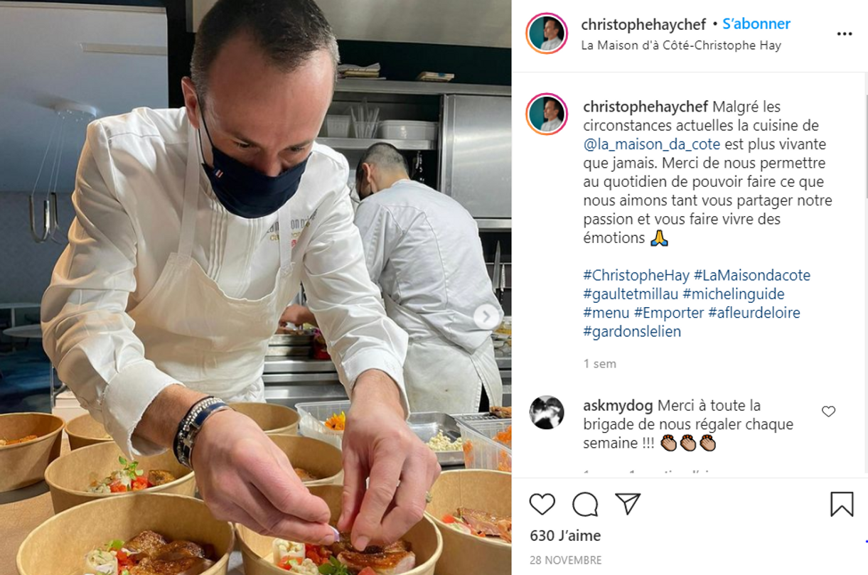 Même si Christophe Hay n’a pu continuer son activité normalement cette année, le chef a su trouver des alternatives. « Il a fallu se projeter, je ne me voyais pas rester à la maison » déclare-t-il à l’AFP. Actif sur les réseaux sociaux, le cuisinier de l’année propose notamment des box en livraison ou des menus à emporter, n’hésitant pas à partager des recettes avec sa communauté. Le chef se montre aussi solidaire, en cuisinant dans les Ephad de sa région.