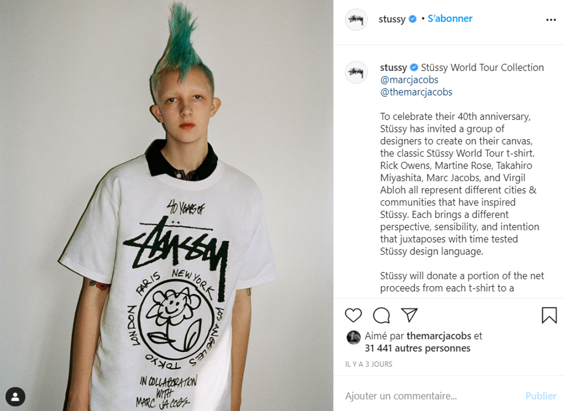 Créé en 1989, le t-shirt World Tour et le fameux logo graffiti sont devenus des emblèmes de la griffe de streetwear fondée par Shawn Stussy en Californie au début des années 80. Cette saison, le label américain a invité cinq créateurs à livrer une ré-interprétation inédite de cette pièce : Rick Owens, Virgil Abloh, Takahiro Miyashita, Marc Jacobs et Martine Rose. Tous ont été conviés à représenter une ville ou une communauté ayant inspiré la marque. « Chacun apporte une perspective, une sensibilité et une intention différente qui se juxtaposent au langage de conception éprouvé de Stüssy » explique la griffe.